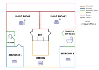 Its an amazing set up as the bedroom and en suite bathrooms are at the back of the apartment and the living rooms are at the front leading out onto one large terrace, Arriving to the 8th Floor the lift brings you to the private floor where you can have two entrances, so if you are thinking of using the property for meetings and private cocktails its offers a great set up as entrance one can lead to one living room and the terrace, and entrance 2 can lead to the second living room and terrace, so you can have two exclusive meeting rooms both 25 square meters each leading out onto an 18 square Meter terrace over looking the Croisette